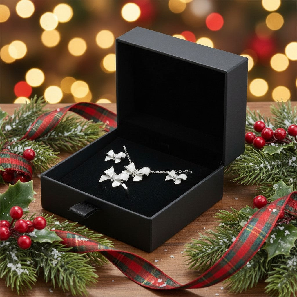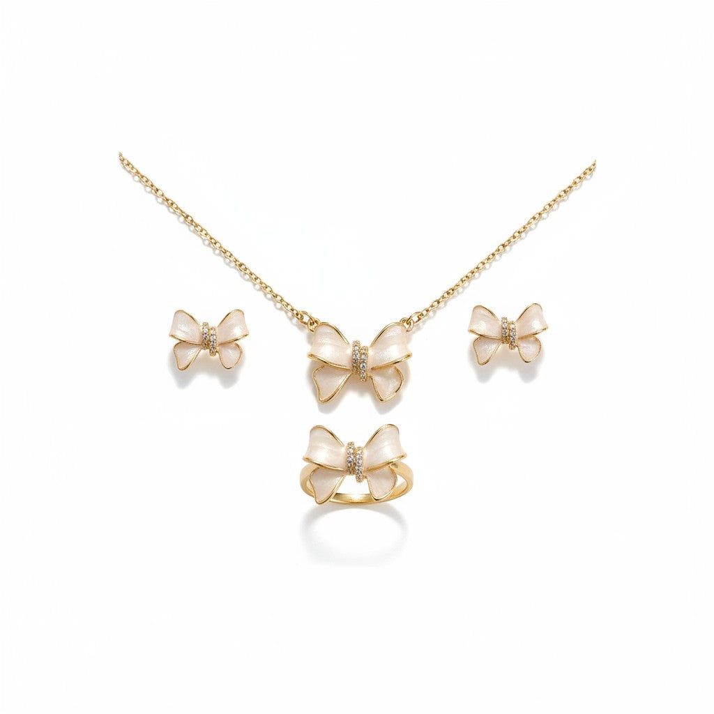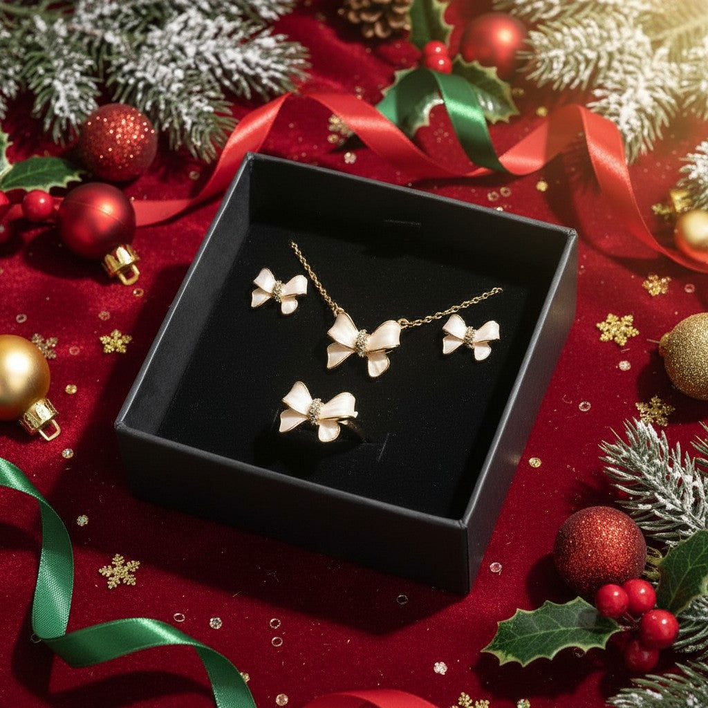 Add a touch of playful elegance to your festive look with the Charm Set, a beautifully coordinated trio of necklace, earrings, and ring. Each piece features a delicate bow design with a pearlescent finish, available in radiant gold or sleek silver. Crafted from high-quality stainless steel, this set is hypoallergenic and tarnish-resistant—perfect for holiday parties, winter weddings, or gifting someone special. The Charm Set is a celebration of femininity, sparkle, and seasonal style.